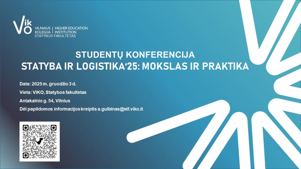 Maloniai kviečiame studentus, mokslininkus ir kolegas dalyvauti studentų konferencijoje „Statyba ir logistika‘25: mokslas ir praktika“, kuri vyks 2025 m. gruodžio 3 d. Vilniaus kolegijos Statybos fakultete (Antakalnio g. 54, Vilnius).