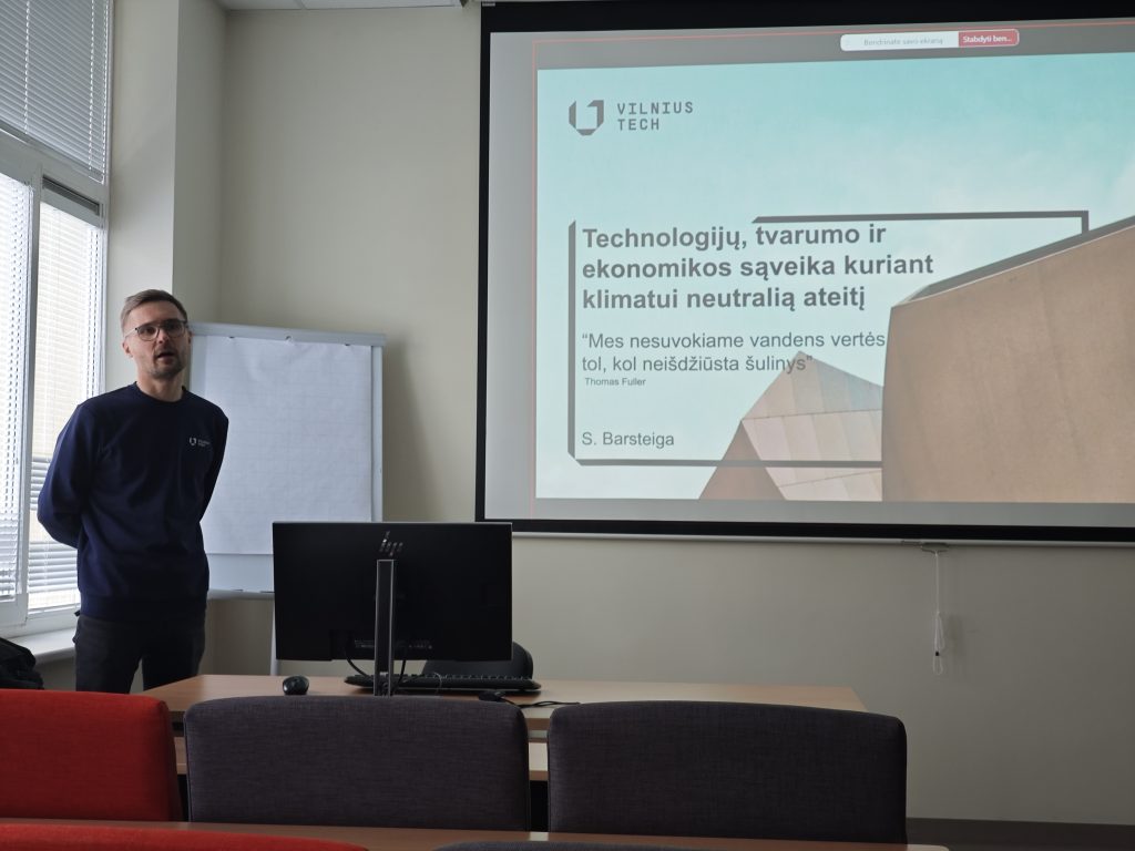 Šią dieną Statybos fakultete (162 aud.) vyko paskaita „Technologijų, tvarumo ir ekonomikos sąveika kuriant klimatui neutralią ateitį“. Paskaitą skaitė Europos klimato pakto ambasadorius, VILNIUS TECH Išmanių ir klimatui neutralių gamybos procesų, medžiagų ir technologijų kompetencijų centro direktorius Simonas Barsteiga. Lektorius klausytojus pakvietė į tvarumą pažvelgti ne tik kaip į teorinę sąvoką, bet ir kaip į praktinį, duomenimis ir sprendimais grįstą procesą.